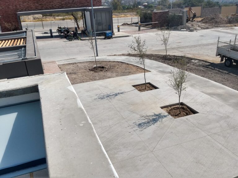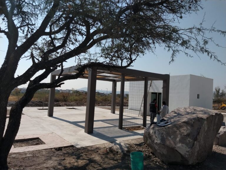 Se desarrollaron andadores peatonales con acabado en adoquín y detalles en pórfido. En el área infantil se instaló un tapete amortiguante adherido a firme de concreto, garantizando condiciones de seguridad. El conjunto se complementó con una pérgola de usos múltiples para los residentes, equipada con baños y bodega de servicio.
