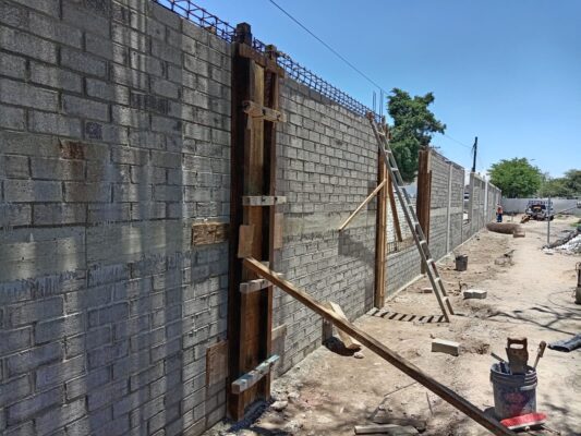 En el proyecto Sapal se construyó un muro perimetral de aproximadamente 300 metros lineales y 2.80 metros de altura para las bodegas conocidas como María Dolores. La estructura se basa en cimentaciones aisladas y cadenas de concreto cada 12–15 metros, con castillos y muros de tabicón reforzados con cadenas intermedias.