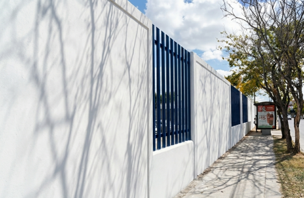 Para mantener visibilidad y sensación de apertura, se integraron rejas en los muros guardianes. Los acabados incluyen estuco y pintura blanca, logrando un equilibrio entre seguridad, funcionalidad y estética.